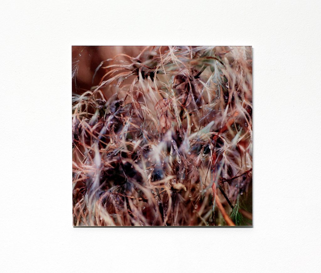 leaking nature ist ein 50 × 50 cm großer, geschichteter Fotoprint auf Acrylglas. Die Arbeit basiert auf Fotografien von Pflanzen im Regen. Durch das Überlagern mehrerer Bildfragmente entsteht ein visuelles Gefüge aus feinen Linien, Tropfen und pflanzlichen Strukturen, das sich zu einer kompakten, beinahe fließenden Oberfläche verdichtet.