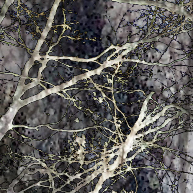 Netzsensibilität nimmt seinen Ausgangspunkt in Fotografien von Bäumen und Ästen. Diese natürlichen Strukturen – verzweigt, unübersichtlich, voller Richtungswechsel – werden zur Grundlage für eine visuelle Schichtung, die weit über das ursprüngliche Motiv hinausgeht.