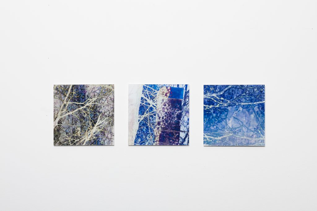 Auf den drei übereinander gelagerten Fotoprints, eingeschlossen in Acrylglas, verwandeln sich die Äste in ein filigranes Netzwerk. Die Linien verlaufen nicht mehr nur als Baumkronen am Himmel, sondern als Geflechte, die an Nervensysteme, Wurzeln oder sogar digitale Netze erinnern. Was ursprünglich aus der Natur stammt, wird hier zu einem Zwischenraum aus Realität und Abstraktion.